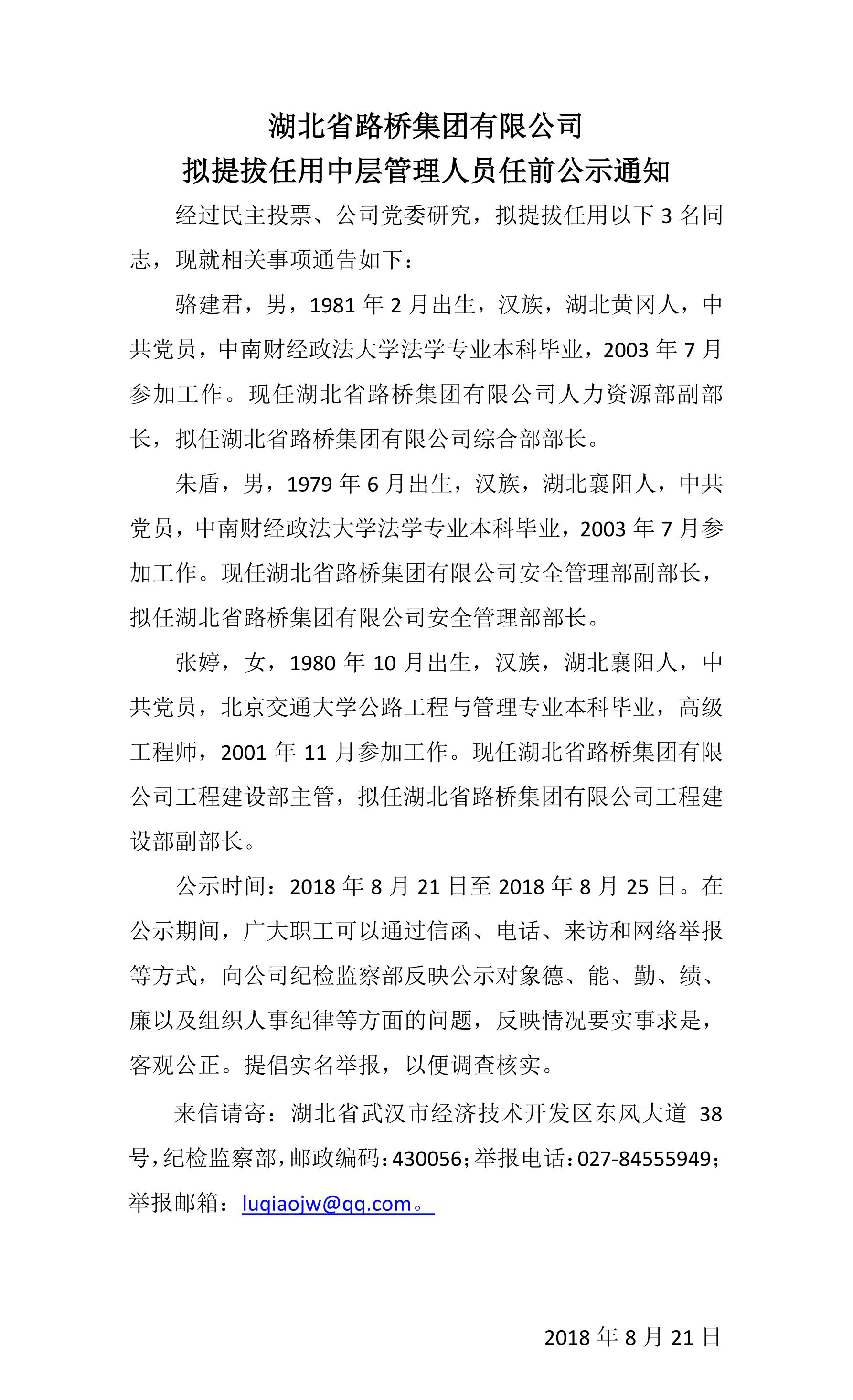2018年湖北省路橋集團(tuán)有限公司擬提拔任用中層管理人員任前公示通知