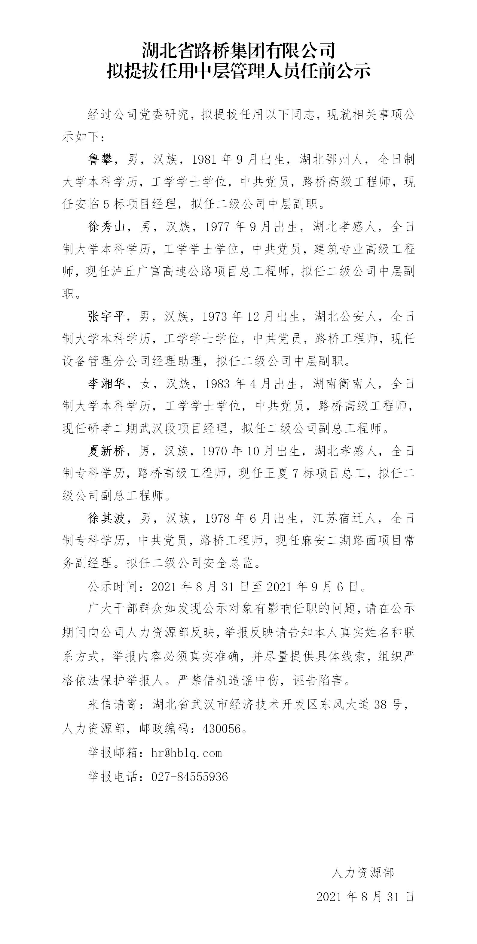 湖北省路橋集團有限公司擬提拔任用中層管理人員任前公示