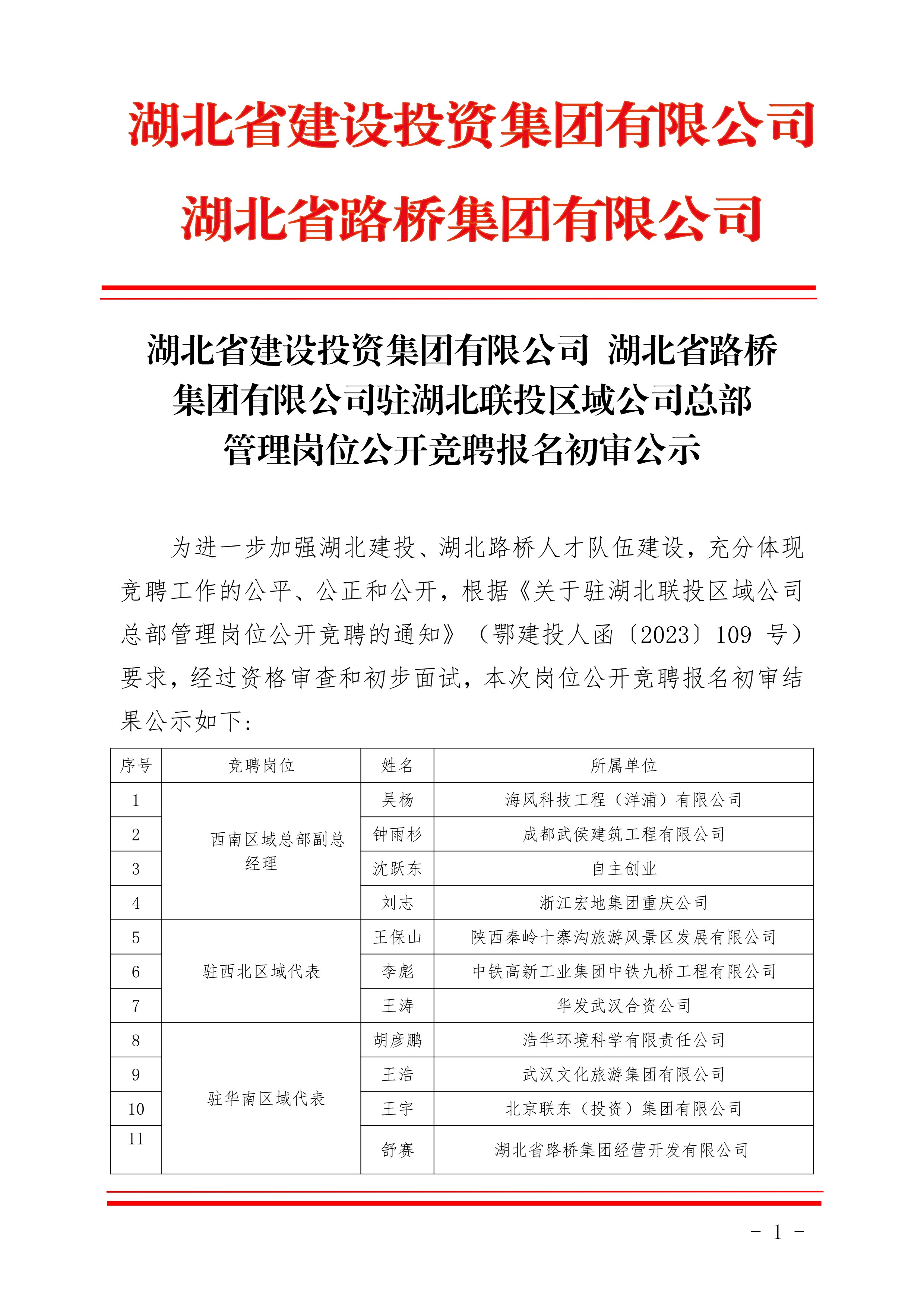 湖北省建設(shè)投資集團(tuán)有限公司、湖北省路橋集團(tuán)有限公司駐湖北聯(lián)投區(qū)域公司總部管理崗位公開(kāi)競(jìng)聘報(bào)名初審公示
