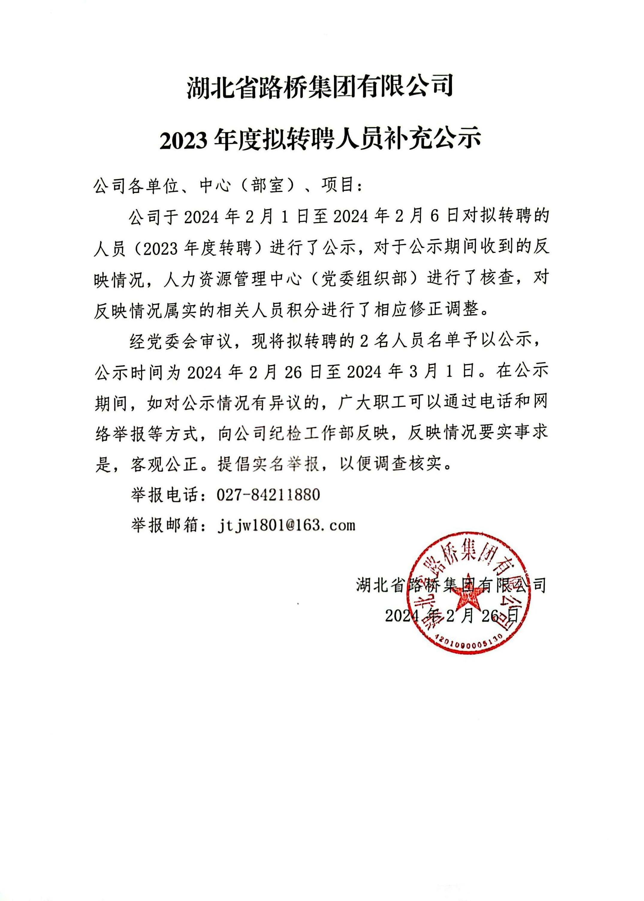 湖北省路橋集團(tuán)有限公司2023年度擬轉(zhuǎn)聘人員補(bǔ)充公示