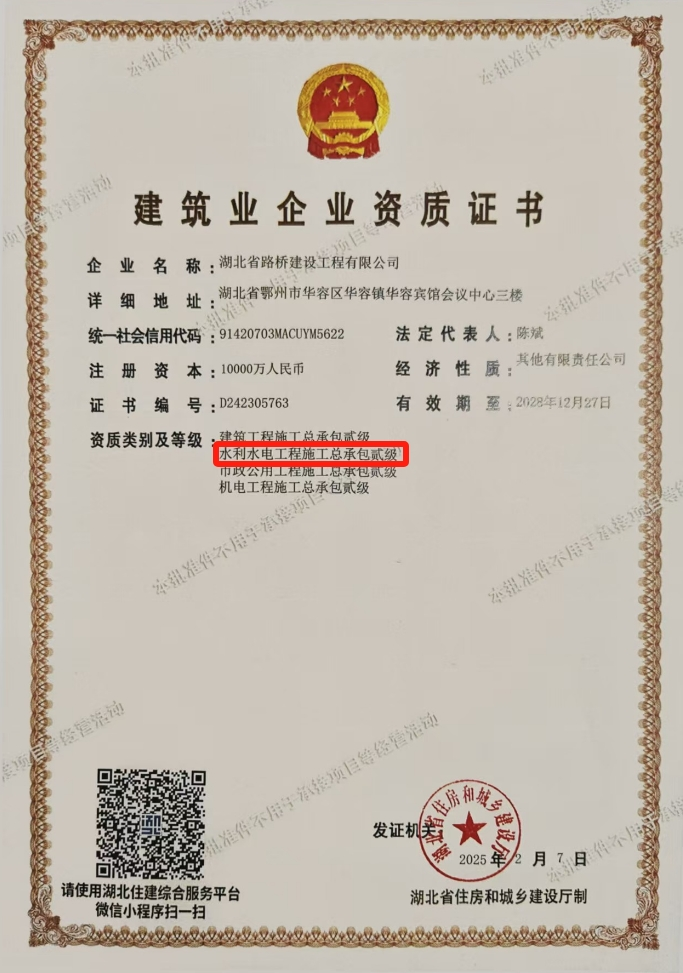 近日,經湖北省住房和城鄉建設廳核準審批,湖北省路橋建設工程有限公司成功取得水利水電工程施工總承包貳級資質。這一成果有效完善了公司資質體系,不僅是對公司在水利水電建設領域專業實力和技術水平的權威認可,更為公司在該領域的市場準入提供了堅實的基礎支撐,標志著湖北省路橋建設工程有限公司可獨立承接水利水電工程。