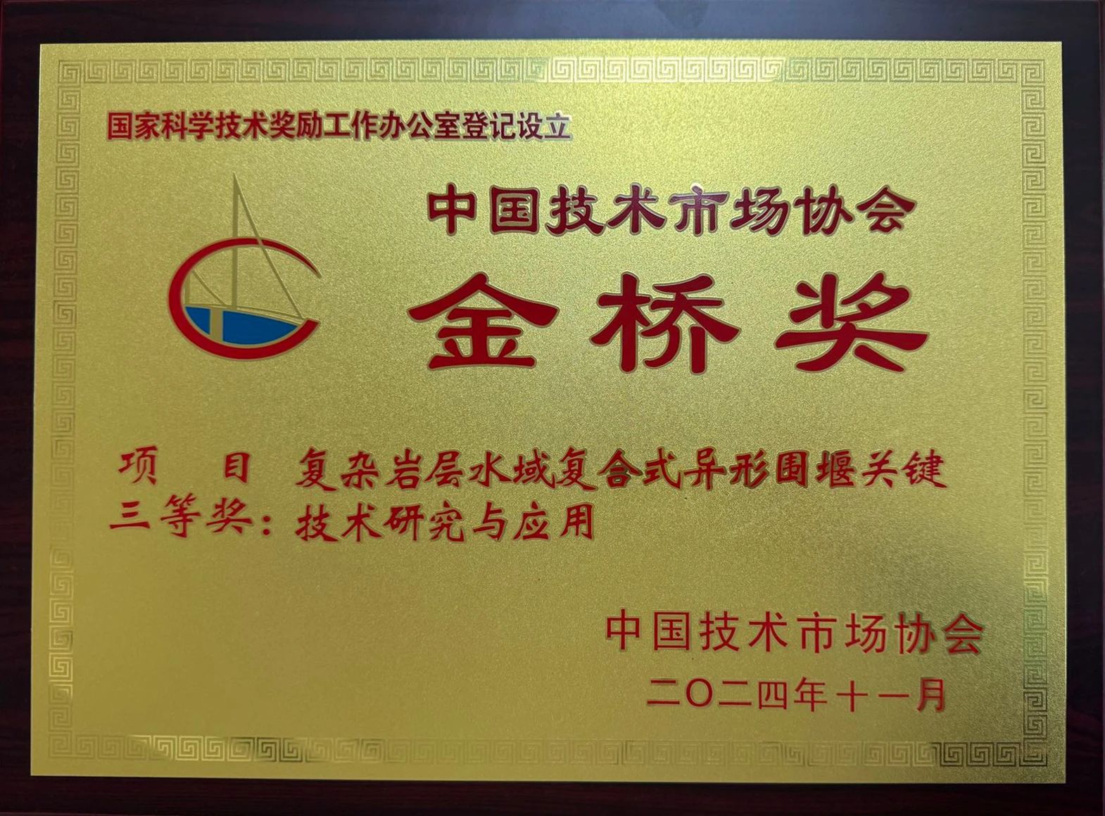 近日,第十二屆中國技術(shù)市場協(xié)會金橋獎在北京召開獎勵表彰大會,湖北路橋主持研究的“復(fù)雜巖層水域復(fù)合式異形圍堰關(guān)鍵技術(shù)研究與應(yīng)用”在近千個項目中脫穎而出,榮獲“金橋獎”項目獎三等獎。這是公司連續(xù)兩屆斬獲該獎項,再次證明了湖北路橋在科技創(chuàng)新成果轉(zhuǎn)化和技術(shù)推廣應(yīng)用領(lǐng)域的卓越實力。