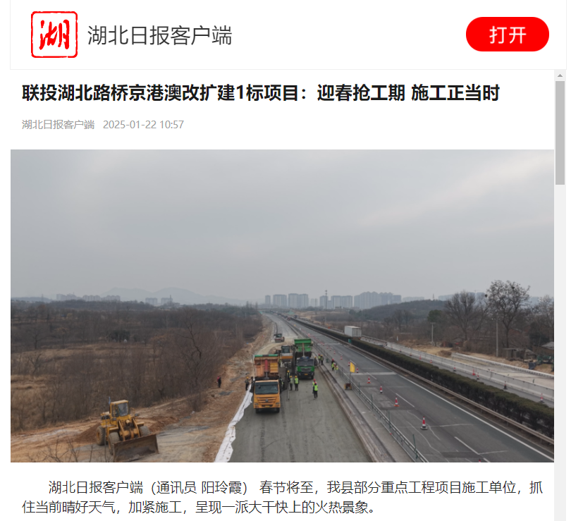 1月22日,湖北日?qǐng)?bào)報(bào)道了聯(lián)投湖北路橋京港澳改擴(kuò)建1標(biāo)搶抓晴好天氣,大干快上的火熱景象,以下是報(bào)道全文: