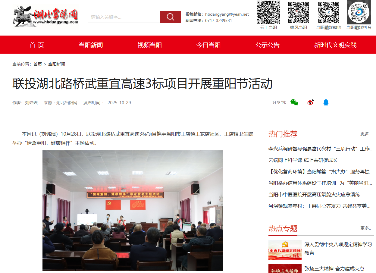 正值重陽節(jié),聯(lián)投湖北路橋武重宜高速3標項目攜手當陽市王店鎮(zhèn)王家店社區(qū)、王店鎮(zhèn)衛(wèi)生院舉辦“情暖重陽,健康相伴”主題活動,湖北當陽網(wǎng)對活動進行報道,以下是報道全文: